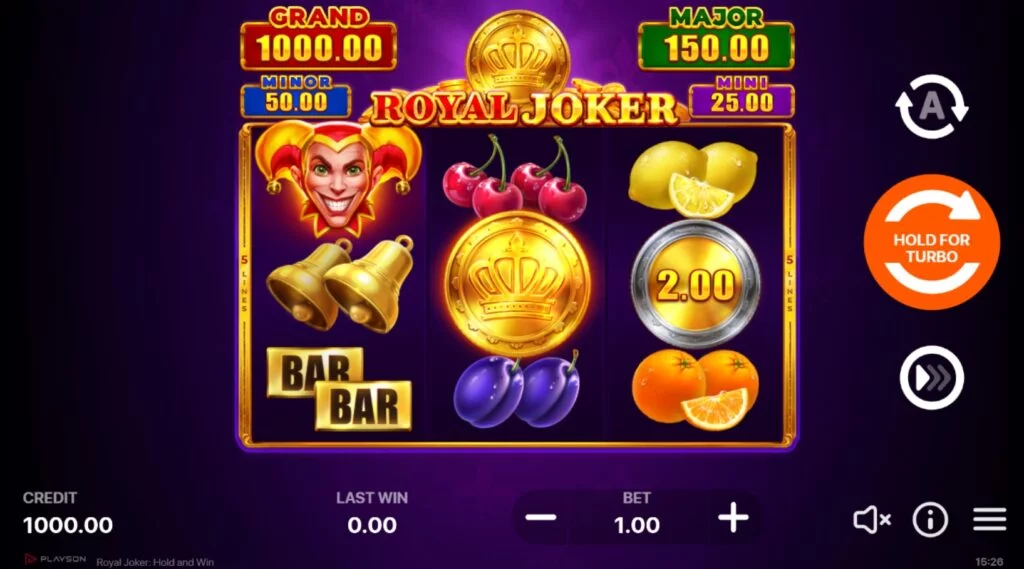 La version démo gratuite de Royal Joker Hold and Win est accessible au début de notre analyse. Cette simulation du jeu Playson offre une exploration de ses mécaniques sans engagement financier. Cela permet aux joueurs de se familiariser avec l'univers aux accents fruités, les icônes traditionnelles et les options Hold and Win avant de miser des fonds réels.